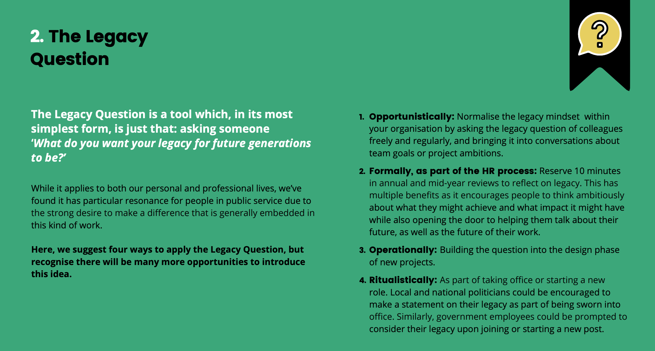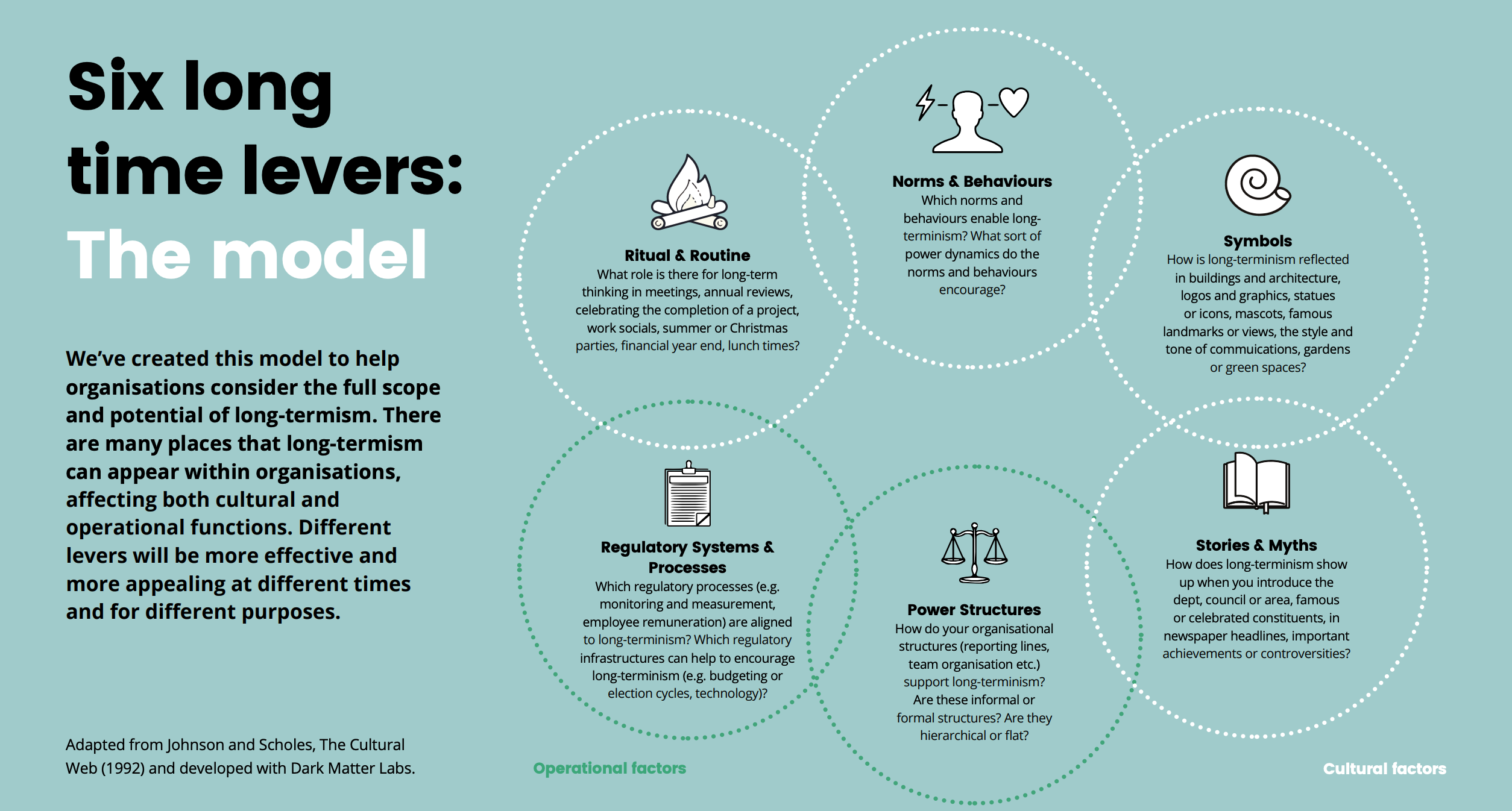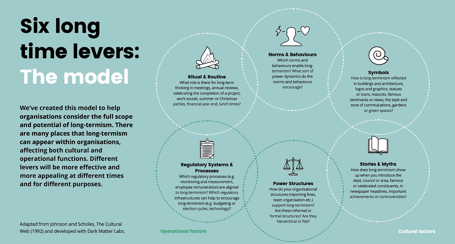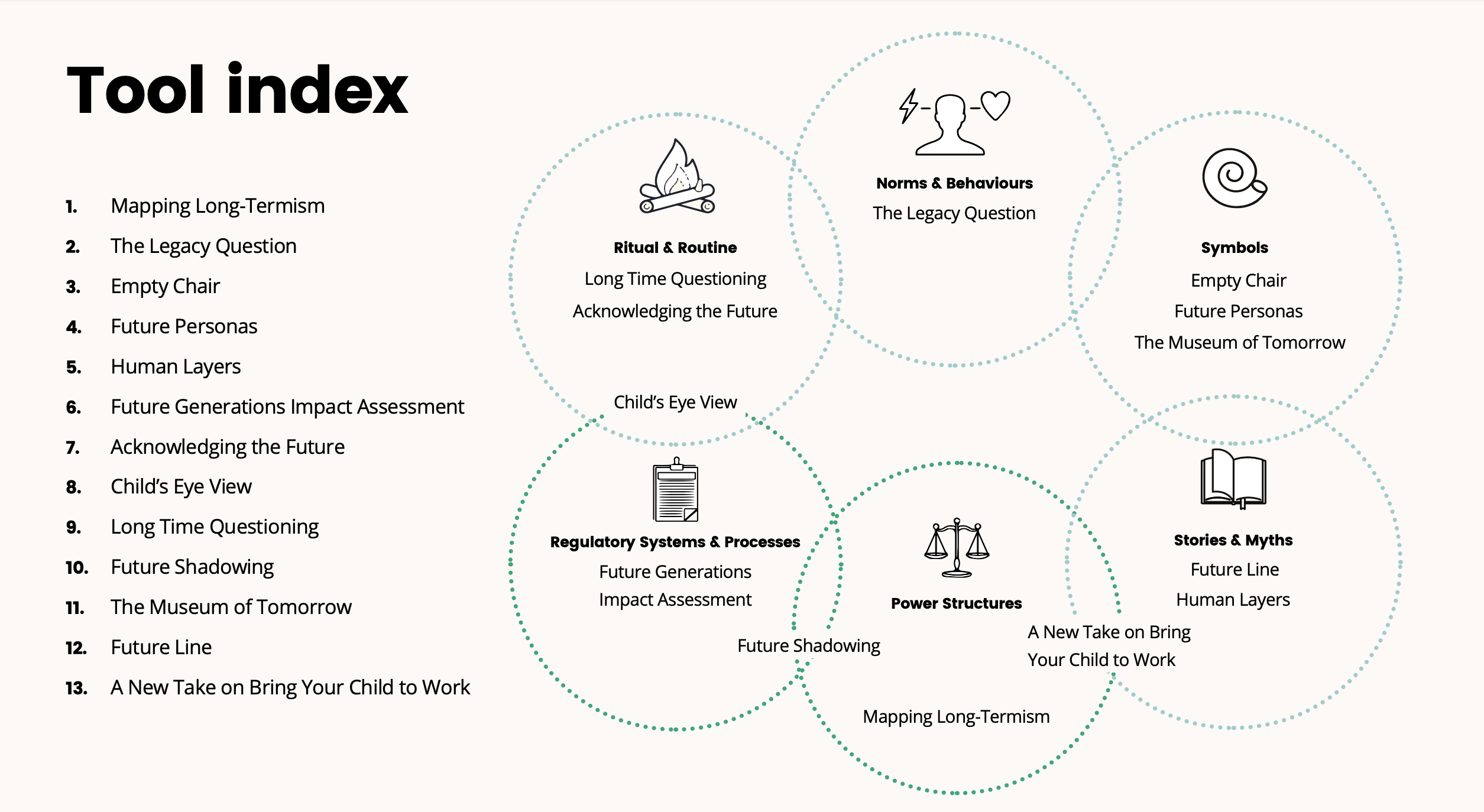 The Long Time Project team has created a toolkit with 6 levers and 13 tools for cultivating an attitude of care for the future.
