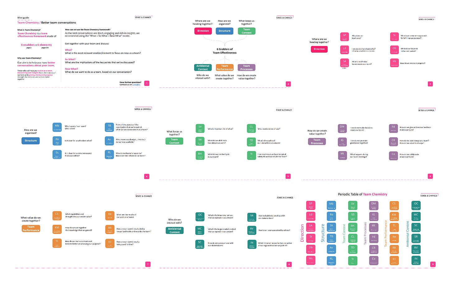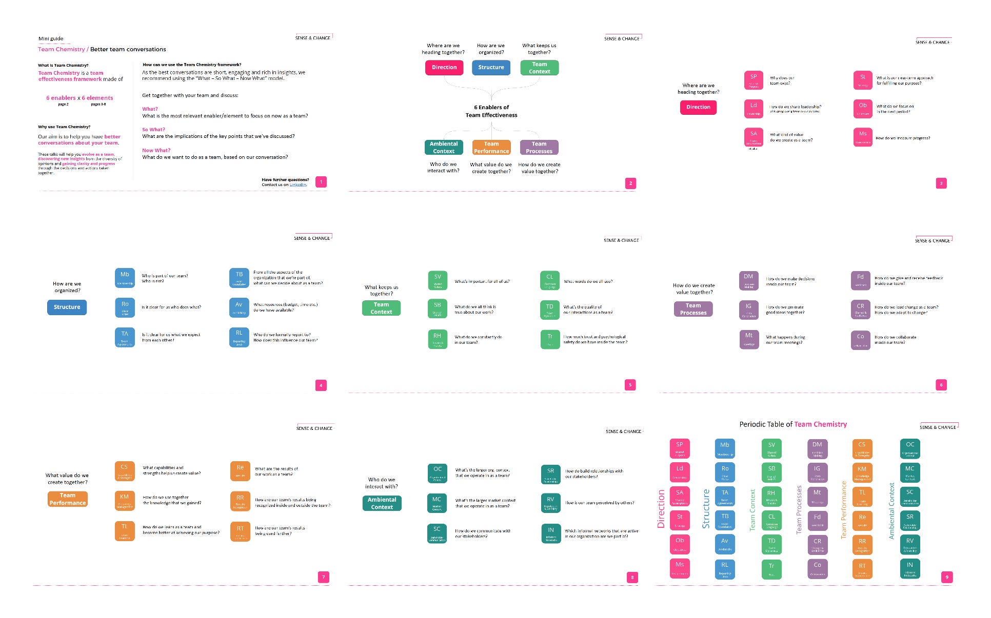The 9-pages DIY guide includes some facilitation tips for the team gatherings + questions associated to each element of the Team Chemistry framework to spark the conversations.