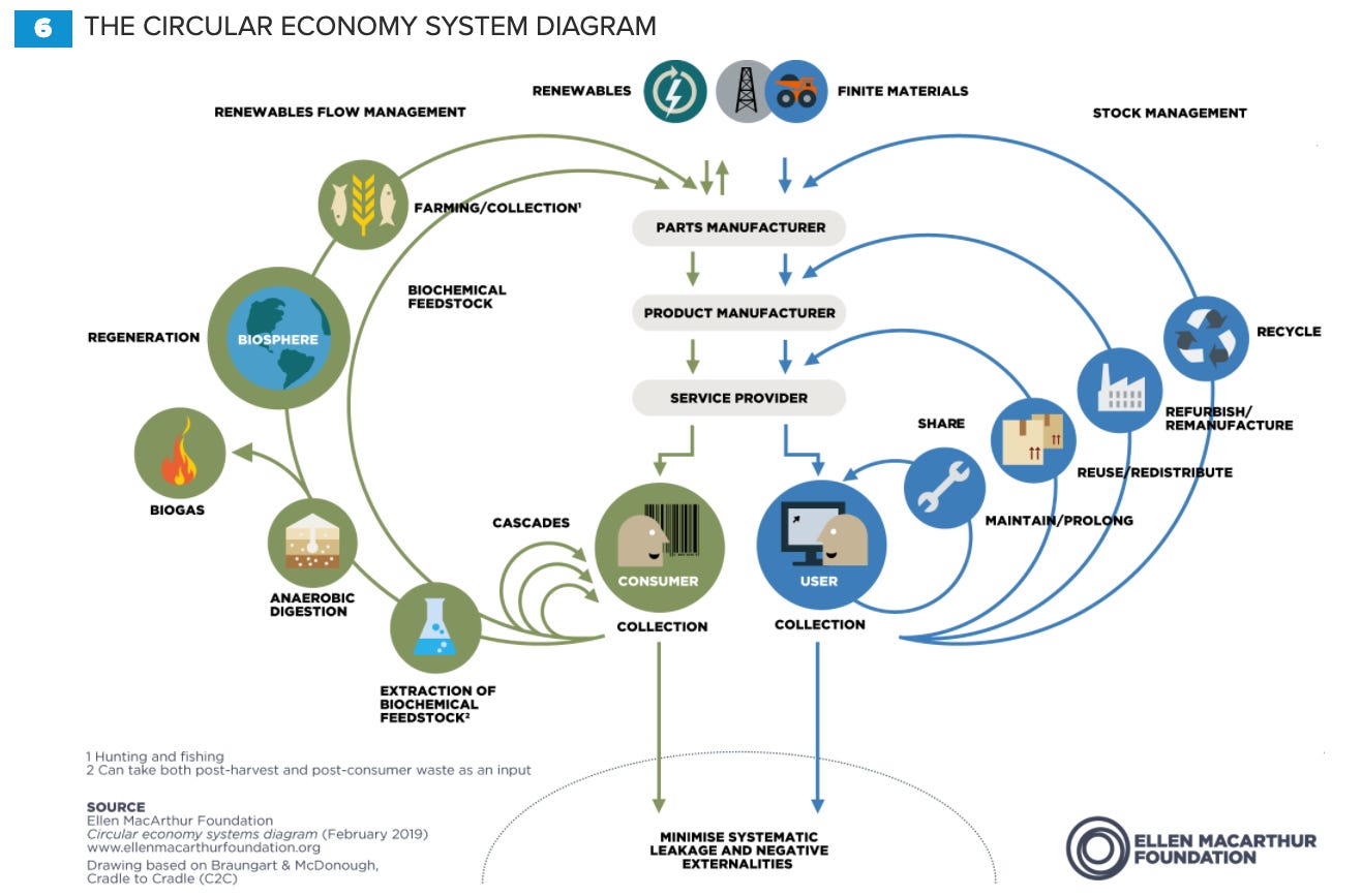 This diagram, created by the Ellen MacArthur Foundation, illustrates some useful distinctions for the practice of designing circular business models (highlights ours):