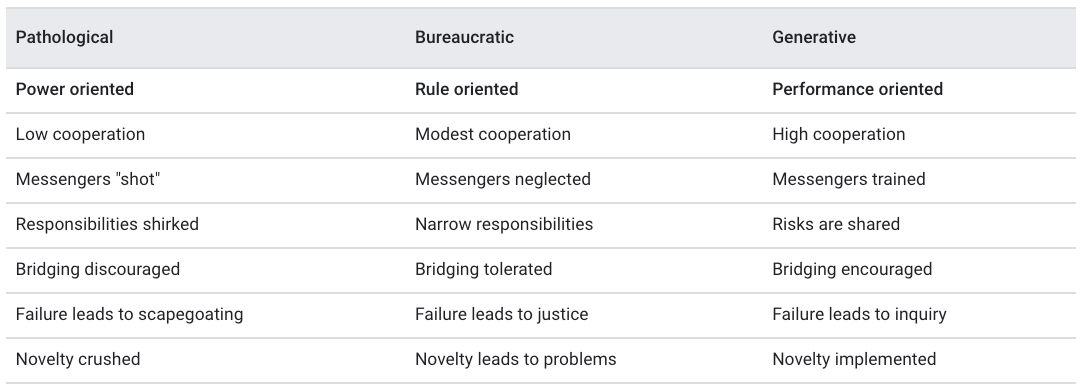4/ OD: The Westrum organizational typology model provides some interesting links between information flows and organizational culture.