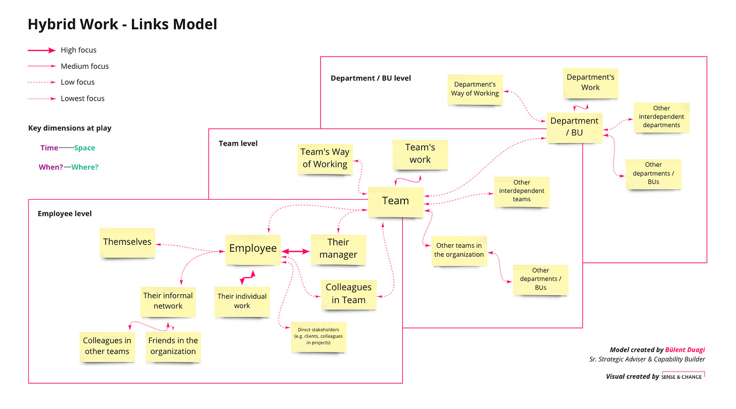 While exploring together the various areas of the unique Links Model of Hybrid Work, you’ll have the opportunity to design various hybrid setup options based on the Configurable Design Elements of: Desired Outcomes, Constraints, Principles and Testing Criteria.